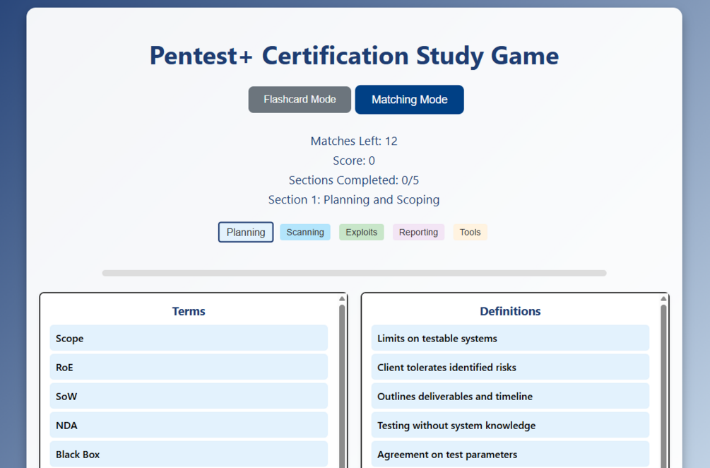 PenTest+ Study Game$9$9https://schema.org/InStockusdIT Study GamesIT Study GamesPlay on mobile or desktop!PenTest+ certification game that will help you study!Add to cartAdd to wishlist New wishlistShareShare on XShare on Facebook Copy linkCopy product URL